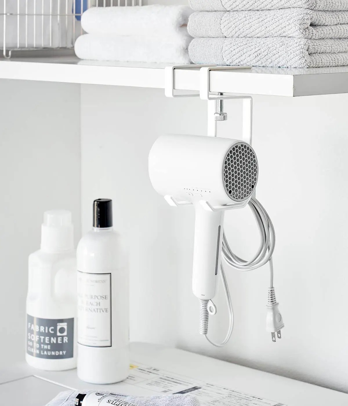 扉の裏やサイドに専用ホルダー: 100均や山崎実業さんなどの「ドライヤーホルダー」を洗面台の扉やサイドに引っ掛けます。使い終わったら「ガシャッ」と差し込むだけで完了です。